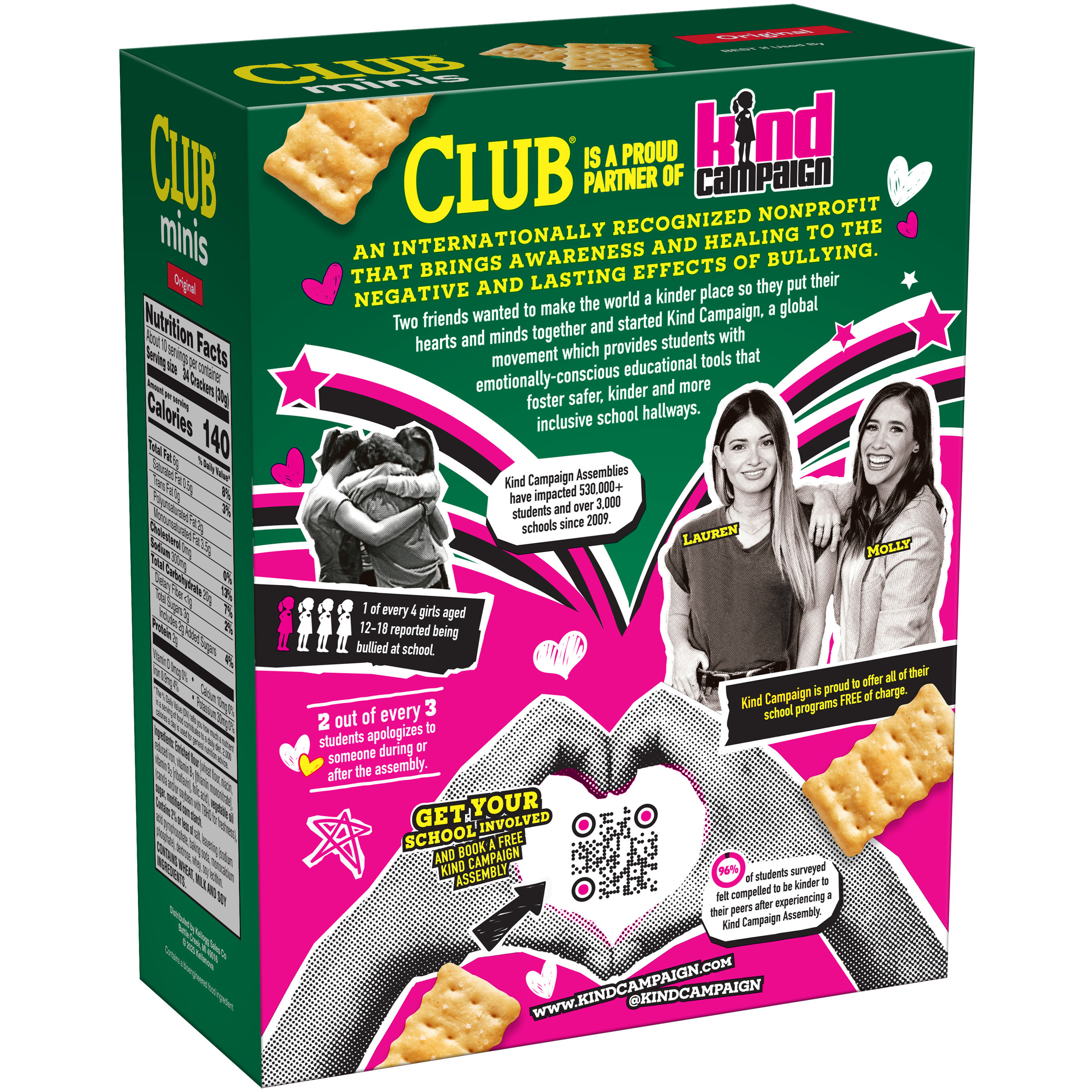 As a very special part of this partnership, Club Crackers is releasing Limited Edition Club Minis x Kind Campaign Boxes, being sold in stores nationwide throughout the season. Each box features information about the Kind Campaign, alongside a QR code for educators, parents, and community members to book an assembly. In addition to raising awareness through the limited-edition boxes, Club Crackers will support the Kind Campaign with a $100,000 donation, furthering the shared mission of creating spaces where every student feels they belong.